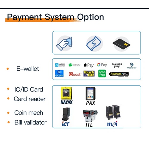 - Payment system Bill/Coin/Card/E-wallet/IC, ID card