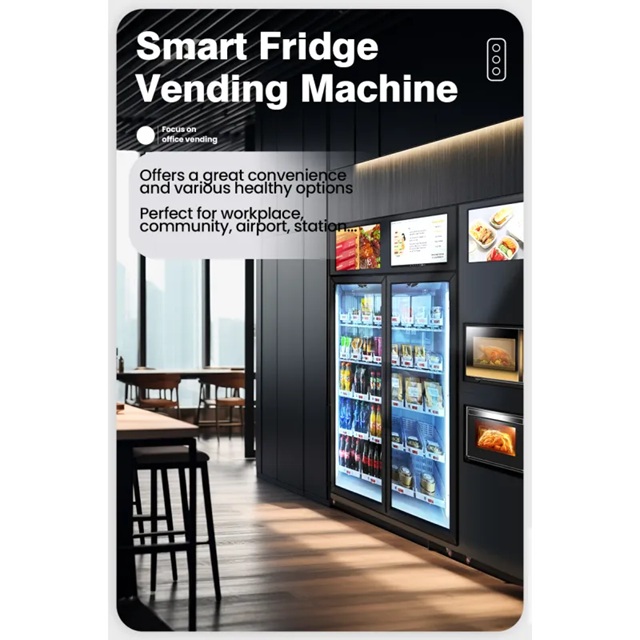 Smart Fridge Vending Machine, equipped with an integrated microwave heating system. Perfect for offices, malls, hospitals, schools, and transit hubs, it combines chilled storage with instant meal heating for ultimate convenience.